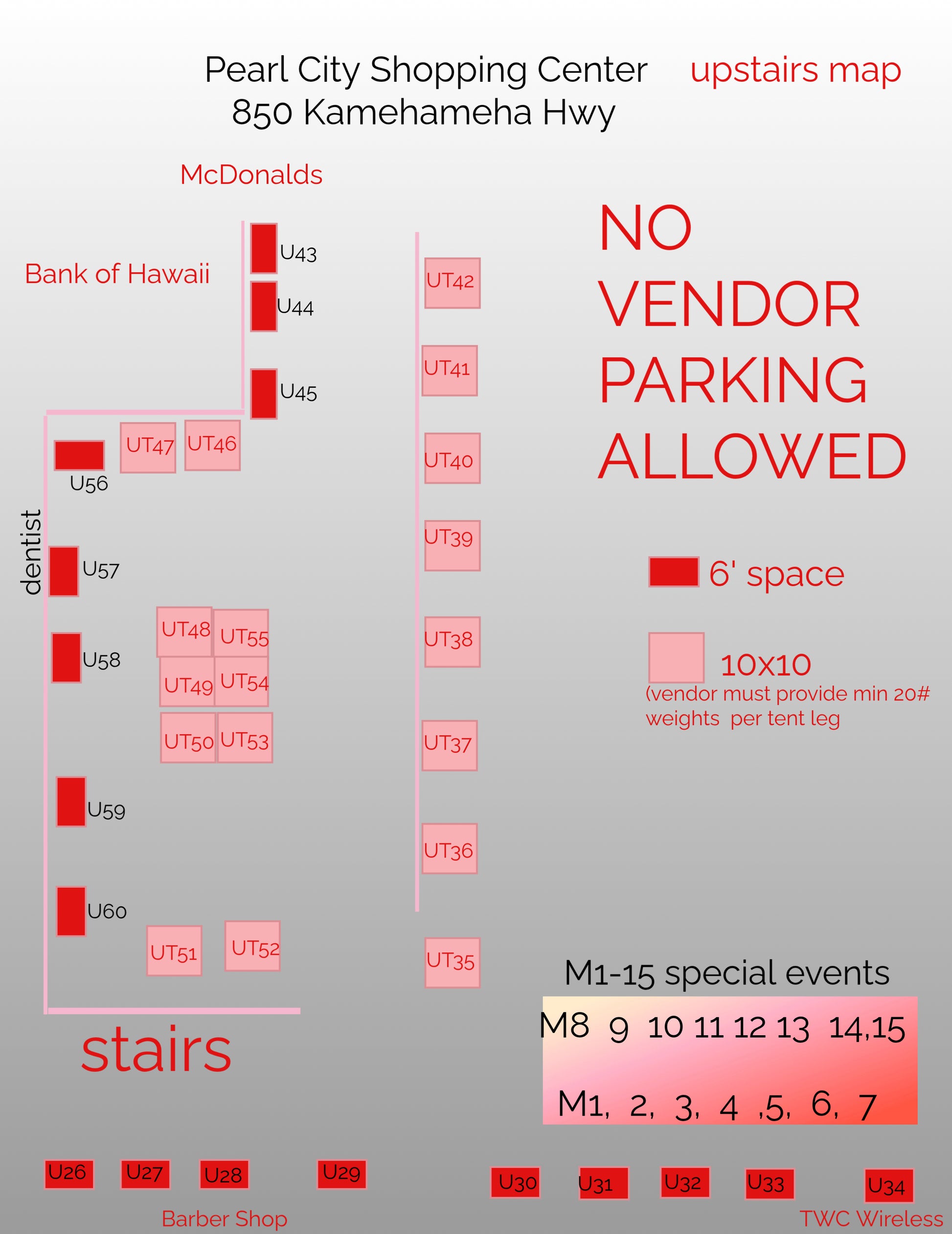 - Parking: All vendors must park in the First Hawaiian Bank lot (stalls facing Kam Hwy) or under McDonald’s. No parking in customer lots. Failure to comply will result in forfeiture of future participation.